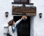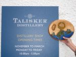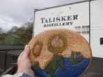 The traveling plaque went to two different spots on Skye today. It made a friendly incursion into Clan Donald lands, and . . . it made a brief appearance at the Talisker Whisky Distillery shoppe!